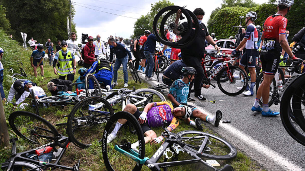 LANDERNEAU, FRANCE - JUNE 26: Bryan Coquard of France and Team B&B Hotels p/b KTM & Kristian Sbaragli of Italy and Team Alpecin-Fenix injury after crash during the 108th Tour de France 2021, Stage 1 a 197,8km stage from Brest to Landerneau - Côte De La FPhoto: Getty Images,
