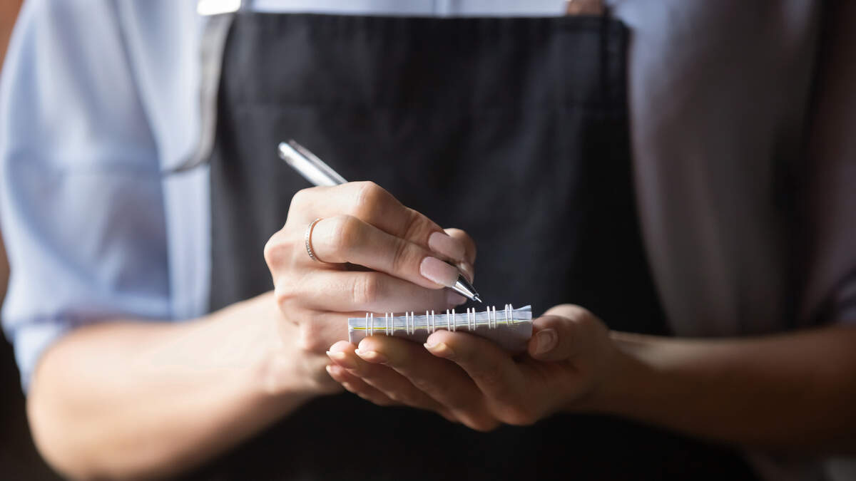 Waitress wear apron holding notepad pen write notes take order